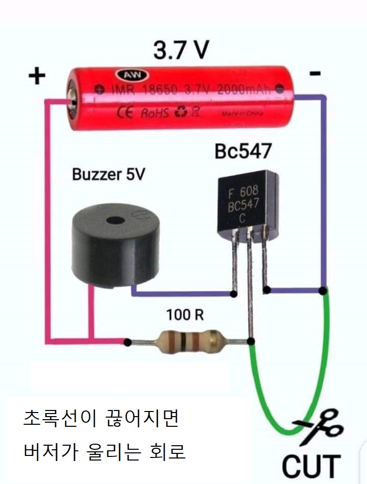 이 원리를 이용해서 초록선이 끊어지면 버저가 울리는 원리를 이용해서 간단한 단선경보기를 만들어 볼 수 있겠습니다.